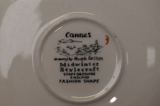 Three Midwinter Stonehenge 'Summer' pattern side plates featuring stylized orange and yellow flowers to speckled off-white porcelain sold alongside a group of seven vintage Midwinter Stylecraft 'Cherokee' dinner and side plates designed by Jessie Tait and two Permaware porcelain dishes featuring geese in flight on a pale blue textured background etc.
