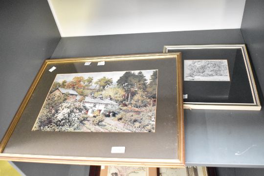 After Alfred Heaton Cooper (British 1863-1929) colour print The 'Bield Little Langdale' within card mount and moulded gilt frame, under glass 25cm x 37cm & 43cm x 53.5cm overall sold along with a small monochrome print 'Seathwaite' indistinctly signed possibly Bill Welinson, mounted, framed and glazed 29cm x 29.5cm overall.