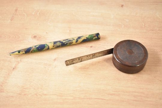 Two 20th-century Bakelite items including one tape measure and one knitting needle, smooth marbled surfaces in mottled brown tones, tape measure with retractable mechanism and metal tip, unmarked, (2).