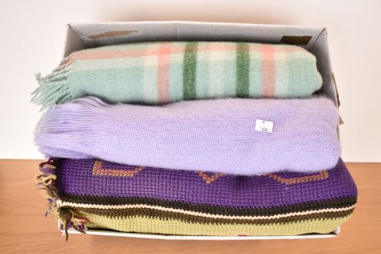 Three woollen blankets, to include a vintage Westmorland travel rug, Made in England, in mint, forest green and rose pink plaid wool, a modern Primark Home example in fluffy lilac open weave, along with a heavy, hand woven striped in purple, green, brown and beige with cross stitch motifs throughout, all measuring approximately 50 x 64 inches.