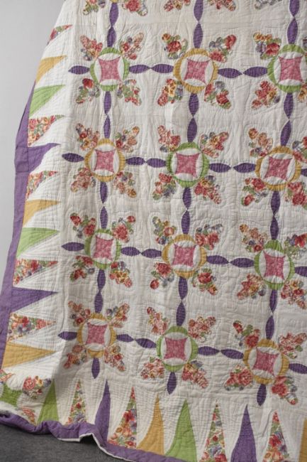 Am 20th century vintage patchwork and applique quilt, having a geometric border enclosing a grid of central flower heads, in purple, green and pink floral fabrics, measuring 80 x 84 inches approximately.