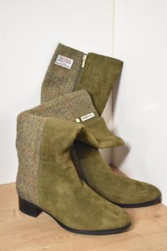Three pairs of ladies tall country or riding style boots, to include a pair of Snow brand boots in khaki heringbone tweed and suede, size 8, a pair of pull on slouchy boots in brown leather with plaid panel, along with a pair of tan knee high boots with lace detail, size 41.