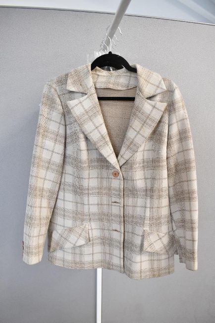 Four 1950s ladies summer party tops comprising three crochet styles with various cuts and details including a waistcoat with teardrop pearl ornamentation, a button down with queen-anne neckline, and a shift with button down back, along with a blue sheer pleated shift top with pearl cutout neckline detail, along with two pairs of matching gloves in crochet and sheer blue to match the tops, and a plaid blazer. Sizes M-L.