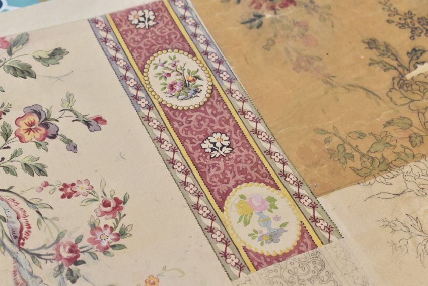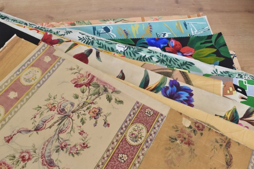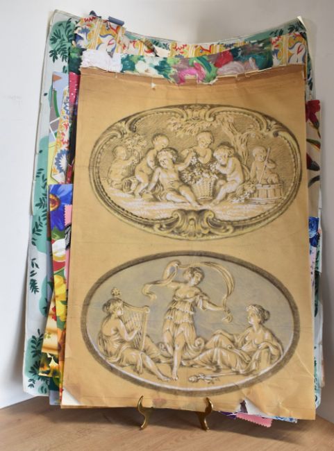 Assorted original antique and vintage hand drawn and painted wallpaper and fabric designs, plans and patterns, mostly floral with some animals, buildings and figure designs, the largest roughly A2, designers include Marc Terrier, Paul Dupont Atalier, Susanna Samson,