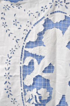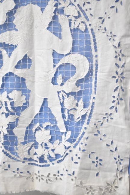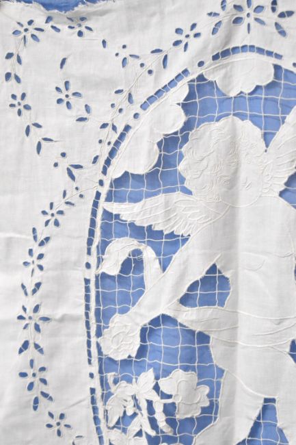 An antique needlework panel featuring a cut-out angel figure, embroidered with grid-lace suspension, cutout floral surround, measures 30 x 34 inches.