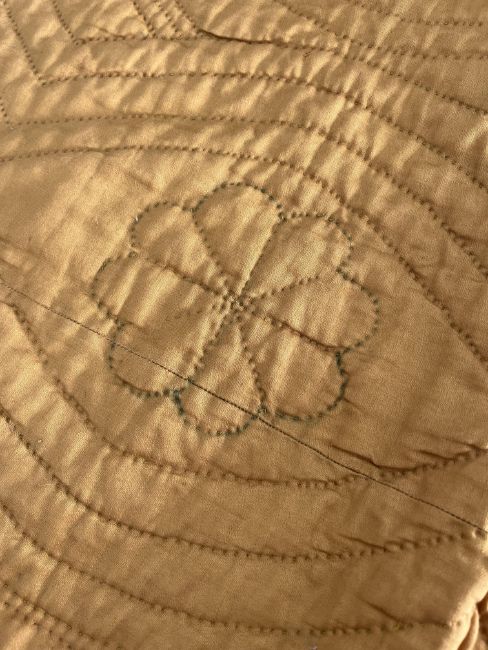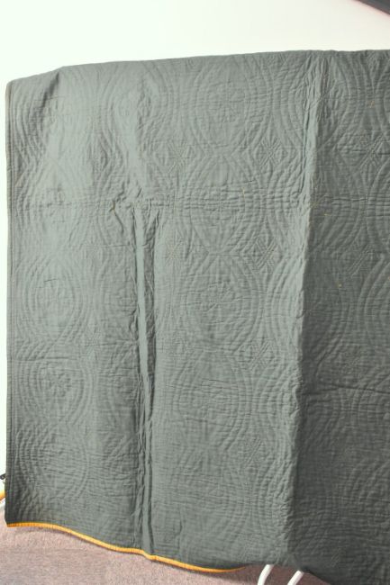 An antique Durham quilt, in rare unused condition, in soft and finely woven forest green fabric, with mustard-gold hand-stitched design with in scallop and flower motif, having a mustard-gold backing panel, remarkably preserved, overall measurements 80 x 86 inches.