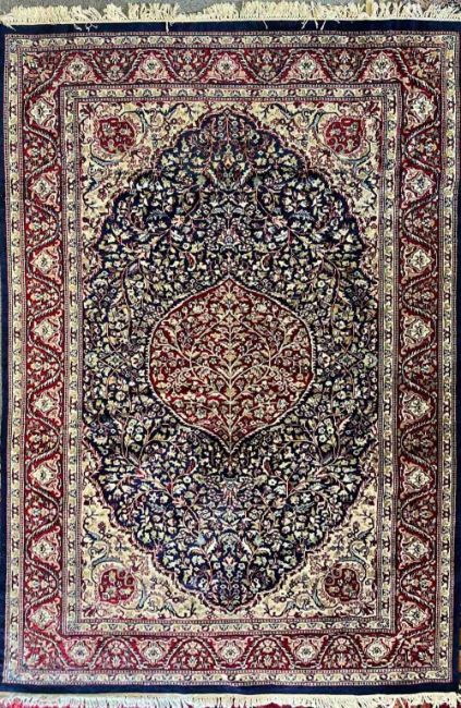A 20th century vintage Iranian rug with an Abrashed cobalt ground, depicting a tree of life motif having brick red central poled medallion, multiple stylised foliate borders, fringed ends, measures 75 x 110 inches, has signs of moths having been present with some balding, a darker patch and some areas.
