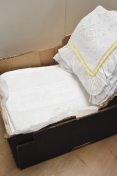 A quantity of 20th century vintage white cotton, crochet and home linens, in lovely condition, including hand embroidered and appliqued examples, 1 box.