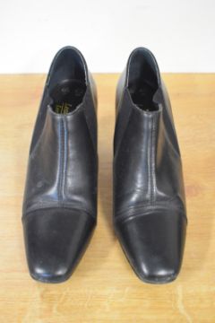 Two pairs of 1990s leather heeled shoe-boots, a black St Michael pair with elastic panels, size 6.5, and a dark brown Yessica pair with inner zip closure, size 6.5.