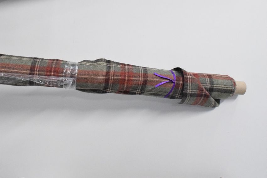 A bolt of Abraham Moon & Sons 100% pure wool in Beningbrough Willow colour way, having a light sage green base, with brown, red and cream check, 150cm by approximately 5-6m.