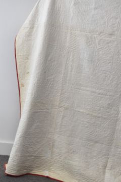 An antique patchwork quilt, with central diamond design in pale ditsy floral fabrics, with red edging and white reverse, with curved and hand-stitched quilting, measures 94 x 100 inches approximately, has signs of age throughout such as discolouration and staining. Along with a vintage floral bedsheet and three satin cushion covers.