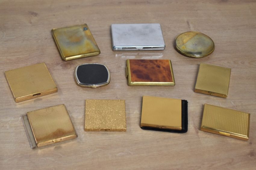 Assorted 20th century vintage compacts, French made or having a French theme, to include Eiffel tower motif, Pauline Bonaparte cameo, engine turned designs, mostly gilt metal, eleven total.