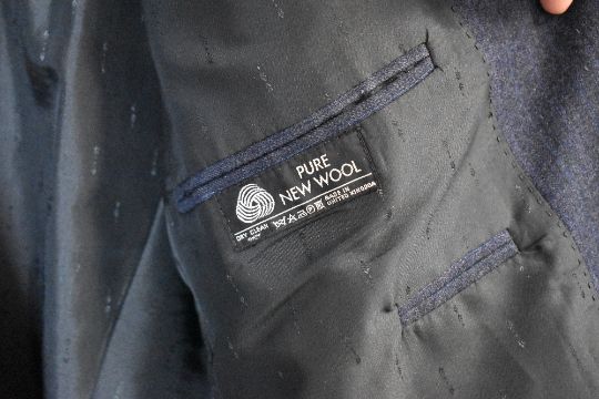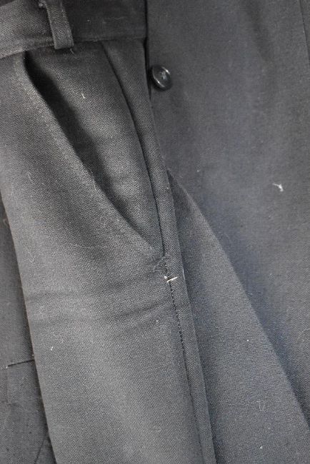 Two vintage trouser suits, comprising a Centaur Gold Collection in navy Pure New Wool with subtle textured pinstripe, from the Fine British Cloth Collection and made in Great Britain, jacket measures 22' pit to pit, has three very small holes, trousers measure 36' waist, 31' inside leg, the trousers are moth eaten in a number of spots, along with a Conform Exclusive 'styled by Brungsberg of West-Germany' trouser suit, in a deep navy fine herringbone weave blend fabric, jacket measures 22', trousers measure 36' together with A vintage St Michael tweed blazer in black and white flecked Herringbone Pure New Wool, Made in the UK, measures 24 inches pit to pit, lovely condition besides some loose buttons.