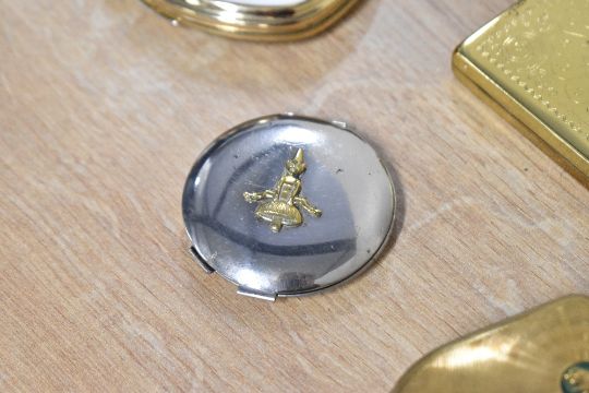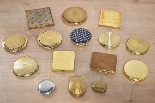 Assorted vintage compacts with an Eastern World influence, to include Stratton Queen Convertible models with tiger design and floral pattern, Marinello, gilt, white metal and padded examples, with peacocks, elephants, dragons, cockerels, mystical and mythical creatures, gods and deities, fourteen in total.