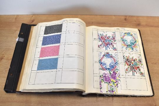 Two French midcentury hardback fabric sample books: one stamped with 'DEGRAVE... 31 March 1950', containing over 400 samples to include cotton, satin and crepe, and another book labelled 'ECHANTILLONNAGE', mostly empty but contains some charming children's fabric designs to include castle and moon motifs.