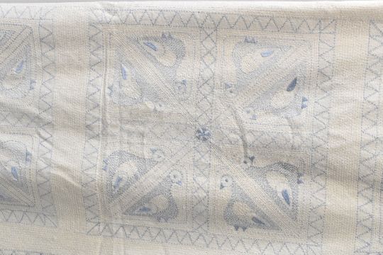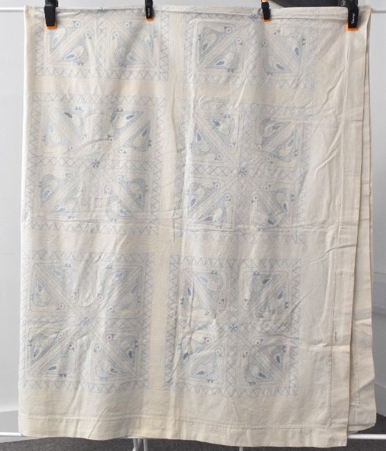 A 20th century vintage Indian embroidered bedspread or throw blanket, in cream cotton with powder blue stitch work, having a central grid repeat pattern depicting birds, puffin or other, and flat folded border, measures overall 86 x 102 inches.