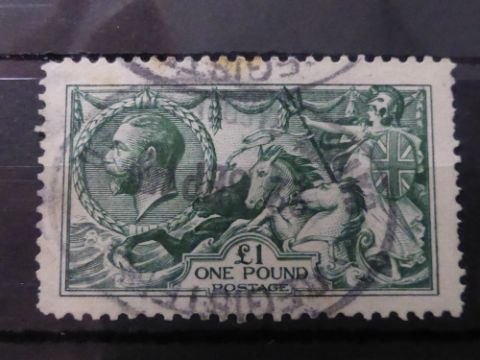 GB 1913 £1 GREEN SEAHORSE, FINE USED IN CARD £1 Green Seahorse in card with light oval registered cancel to middle. We not a few nibbled perfs to right hand side and bottom left. Also signs of a rusting spot to top to middle.