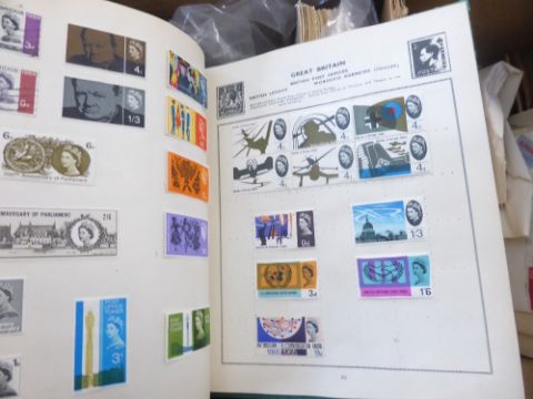 GB & WORLDWIDE STAMPS ALBUMS AND LOOSE ALONG WITH TRADE CARDS ETC Box with various albums and loose stamps in packets etc. Also noted within cigarette cards and trade cards. Good sorter lot.