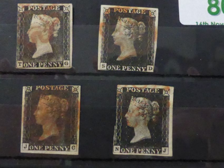 GB 1D BLACK RANGE OF 4 x 3 MARGIN BLACKS IN STOCKCARD Range of 4 penny blacks, all with 3 margins, and all tied with red maltese crosses.