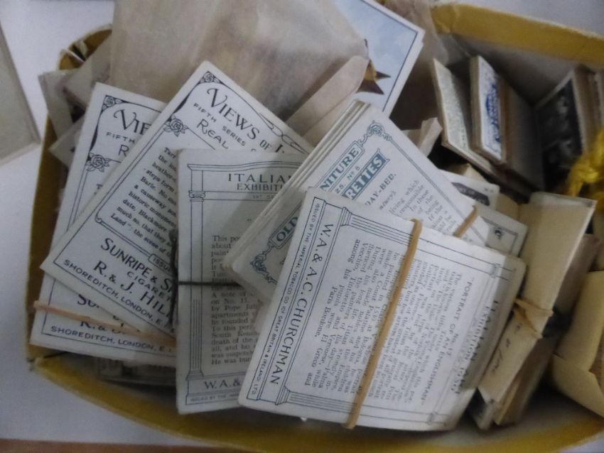 CIGARETTE CARDS, VARIOUS PUBLISHERS, COLLECTION OF SETS & PART SETS + PHILATELIC BOOKS Couple of boxes and an album along with two softback books (philatelic) with ranges of Cigarette cards, much in part sets it would appear. Various size format cards noted, along with various publishers eg Wills, Players etc.