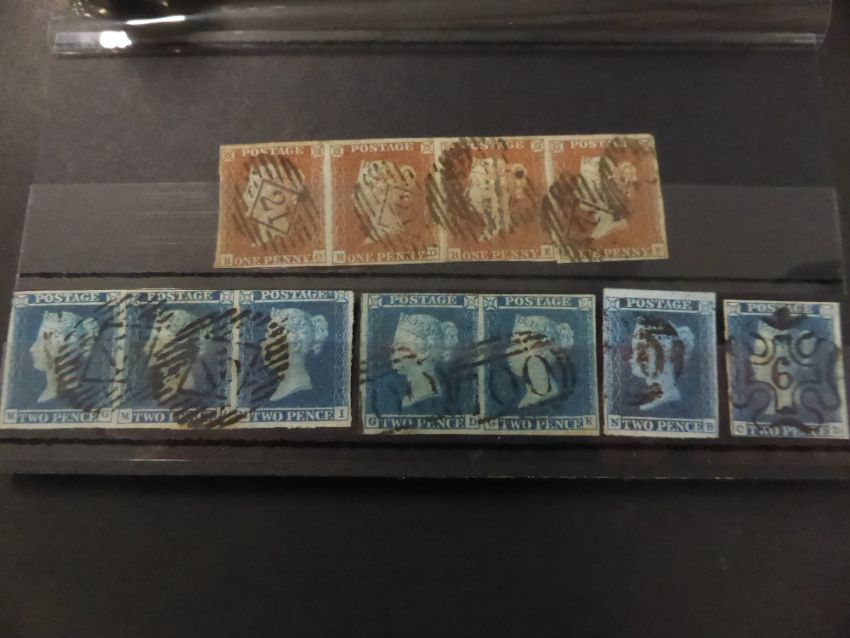 GB 1840's 1d RED IN STRIP OF 4 ALONG WITH VARIOUS MULTIPLES OF 2d BLUES Card with fine array of reds and blues. Top row imperf strip of four Corner letters RC-RF All tied with diamond 21 Cancel. Further trio of blues, and pair and two singles including the last blue in card a plate 3 lettered CD With fine upright black maltese cross with no.6 in cross. Close to good square margins.