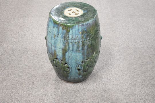 A Chinese mottled/dripped green glazed pottery garden seat, of typical barrel form with pierced and moulded decoration, and pierced 'handles' 52cm x 35cm some glaze losses