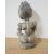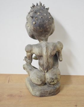 An interesting Indonesian carved wooden figure of a seated, naked emaciated grotesque, modelled seated holding what appears to be a 'bone', the figure with inset animal teeth and shell hair 48cm