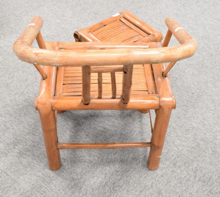 A Chinese bamboo armchair, having a tub style bent back and arms, sold with footstool, seat height 36cm