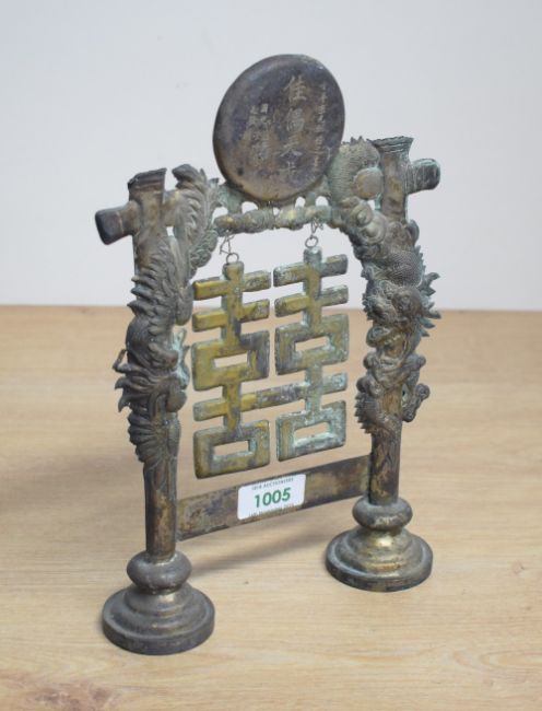 A Chinese moulded brass 'Double Happiness' symbol, the Chinese characters within dragon and phoenix adorned uprights 26cm