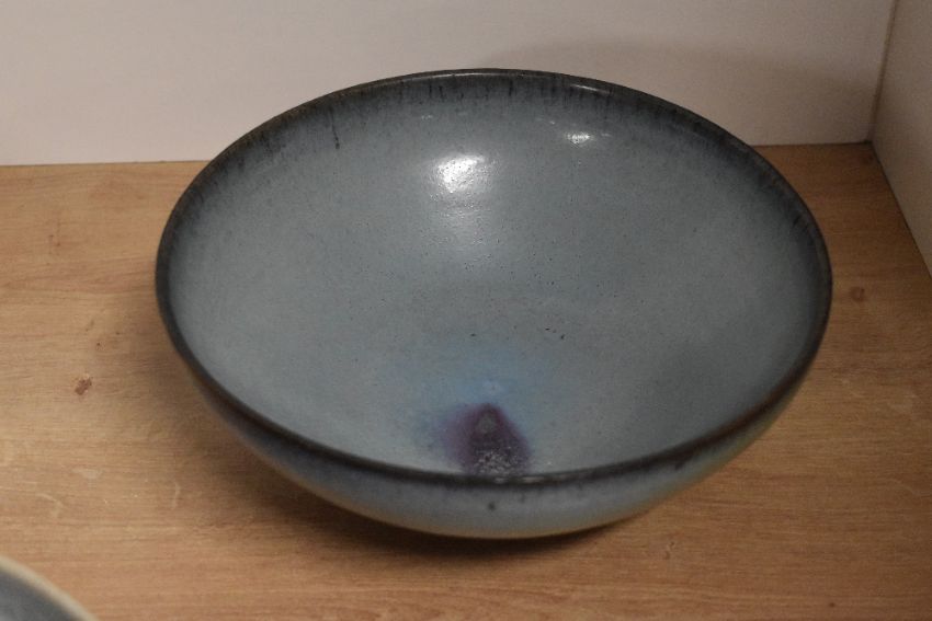 A Chinese 'Jun Ware' pottery bowl of dished circular form with typical blue glaze and band of roundal decoration to the exterior rim, all raised on three short feet, 9cm x 20.5cm sold along with another Chinese Jun Ware bowl with short circular foot 9cm x 21cm & similar bowl, lighter in colour with mottled glaze and with smaller circular foot 9.5cm x21cm