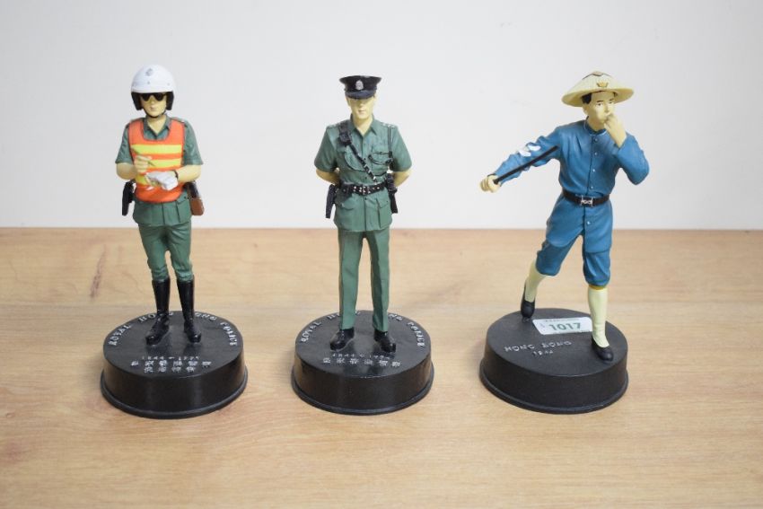 A group of three painted cast-resin Hong Kong related figures 'Hong Kong 1844' 'Royal Hong Kong Police Traffic Police' and 'Royal Hong Kong Police' 18.5cm