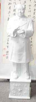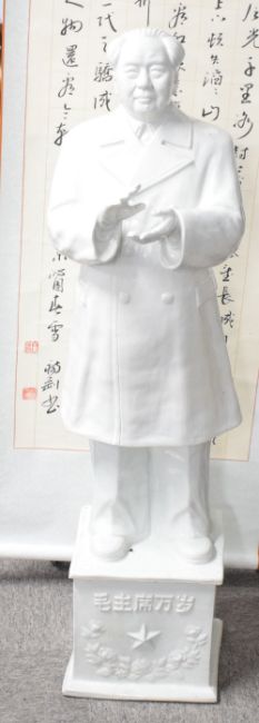A large Chinese Maoist/cultural revolution blanc-de-chine figure of Chairman Mao, modelled standing with hands raised in applause, raised on a socle type base with moulded characters roughly translating as 'Long Live Chairman Mao Zedong' over a laurelled star, 129cm cracks and evidence of repair to base.