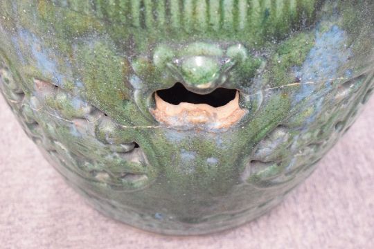 A Chinese mottled/dripped green glazed pottery garden seat, of typical barrel form with pierced and moulded decoration, and pierced 'handles' 52cm x 35cm some glaze losses, cracks.
