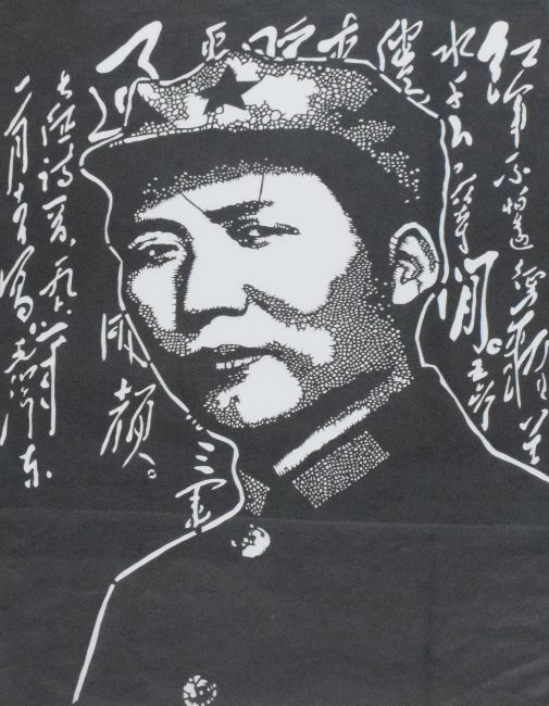 A Chinese Maoist/Cultural revolution wood cut type poster, depicting a young Chairman Mao Zedong surrounded by script, in black mounted within a card mount and red-stained wooden frame, under glass 59cm x 46.6cm overall.