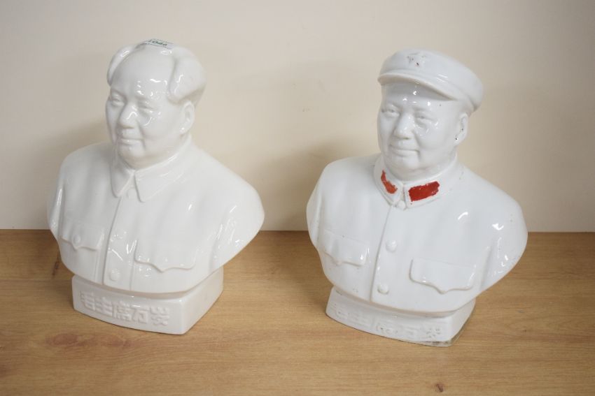 A Chinese Maoist/cultural revolution blanc-de-chine bust of Chairman Mao Zedong, the base with moulded text/characters roughly translating as 'Long Live Chairman Mao' sold together with another similar bust of Chairman Mao Zedong with cap and remains of red colouring to his collar 28cm