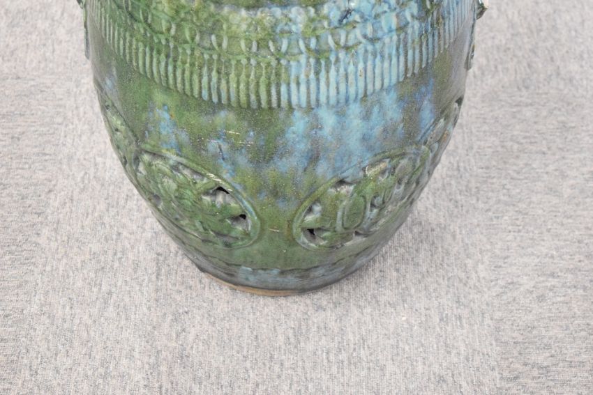 A Chinese mottled/dripped green glazed pottery garden seat, of typical barrel form with pierced and moulded decoration, and pierced 'handles' 52cm x 35cm some glaze losses