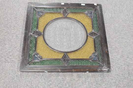 An unusul antique Chinese coloured and etched glass window panel, the central circular etched glass panel with inscription, within pressed and coloured glass panels and shaped glazing bars, 72cm x 75cm