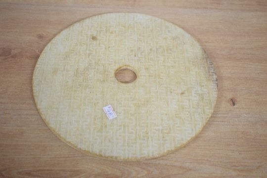 A large Chinese carved stone Bi/Yubi type disc, of circular form with central aperture, profusely carved in shallow relief with interlocked C-scrolls, 27cm