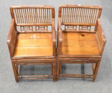 A pair of attractive 20th century Chinese bamboo armchairs, of traditional square section form with spindle rails and solid seats, seat height 49cm