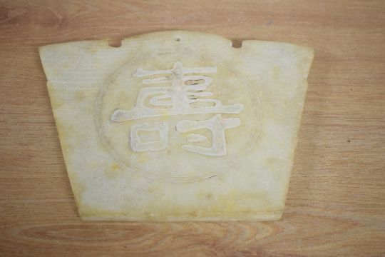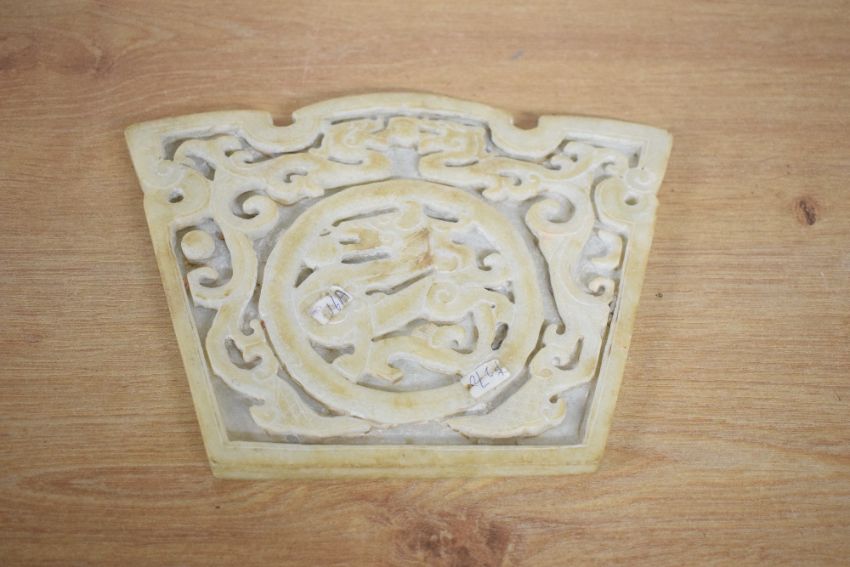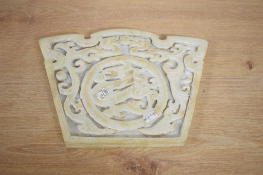 A decorative Chinese carved and pierced mottled stone Bi/Yubi type disc/carving, of circular form with central roundal within openwork stylised dragons, the reverse with character for longevity or long life, 16cm x 21cm