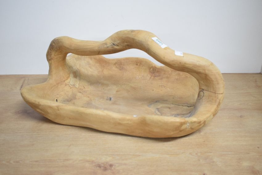 A carved and shaped hardwood fruit basket, of asymmetrical form with integral over handle, unfinished/untreated surface 43cm