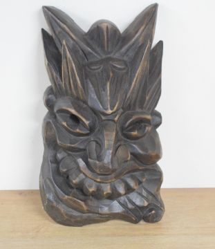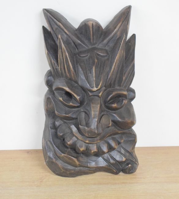 A decorative Chinese carved wooden mask, carved in high relief with grotesque features, 26.5cm