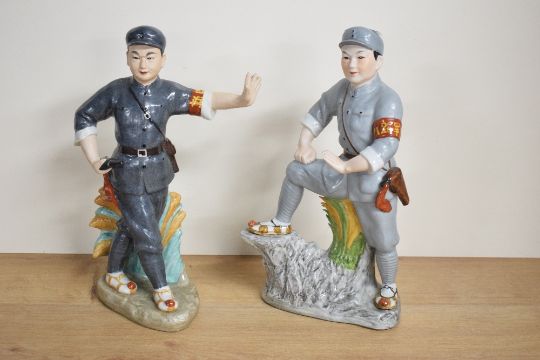 Two Chinese cultural revolution glazed bisque porcelain figures, depicting guards/soldiers, interestingly wearing traditional footwear rather than boots, largest 30cm