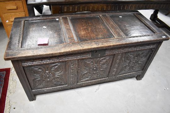 A period oak chest having triple carved panel, dimensions approx. W135 H65 D58cm