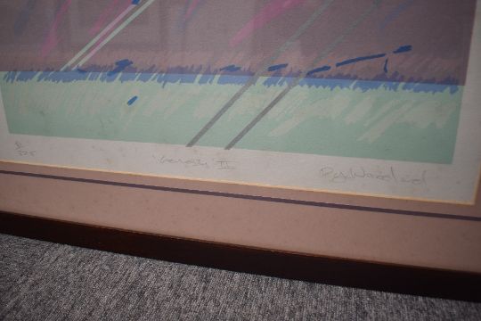 Roy Fairchild-Woodard (British b.1953) limited edition colour print 'Genesis III' coastal landscape with abstract detail in pastel tones, signed, entitled and numbered 90/225 in pencil to margin, within a pink card mount and stained wooden frame, under glass 74cm x 53cm & 95cm x 74cm overall.