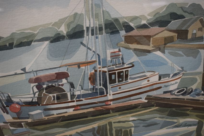 Jack Campbell (Canadian 1930) Watercolour, depicting a docked fishing boat (possibly on Saturna Island) in his recognisable style which he described as 'pieces of light' , signed lower right, within card mount and moulded wooden frame, under glass 38cm x 28cm & 63.5cm x 53cm overall.