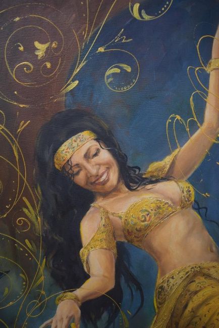 Sergi Yatsenko (UAE Contemporary) Oil on canvas 'Belly Dance', an accomplished depiction of a female belly dancer with gold coloured spiral embellishment capturing the movement of dance, signed and dated (2003) lower right, counter signed titled and dated verso, 101.5cm x 76cm overall.