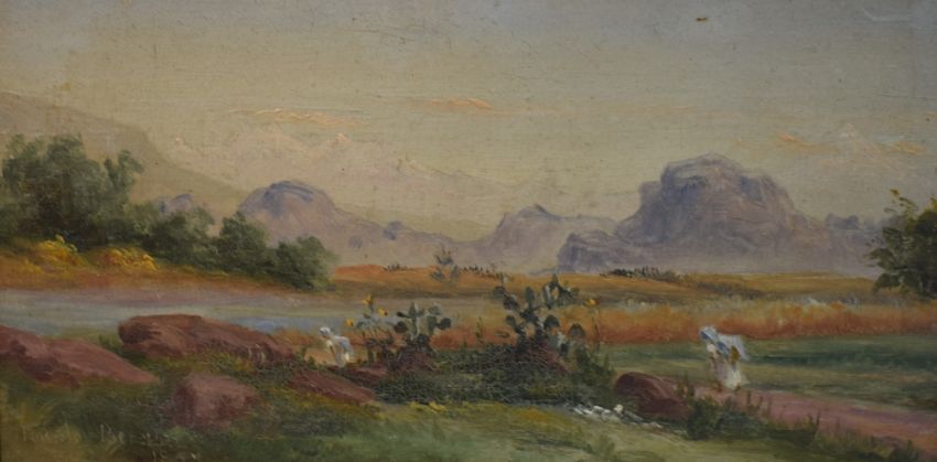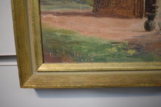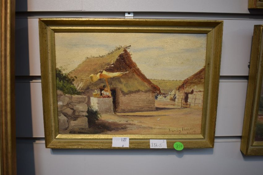 Townley Benson (Canadian 1848-1907) oil on board, a dwelling beneath mountains with woman working outside, signed lower left and dated '1807', within gilt frame 28.cm x 17cm & 32.5cm x 20.5cm overall, sold alongside two slightly smaller landscapes of a similar theme and date by the same artist.
