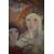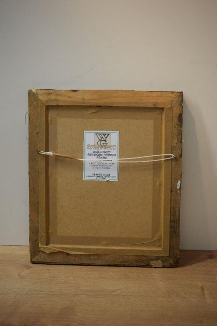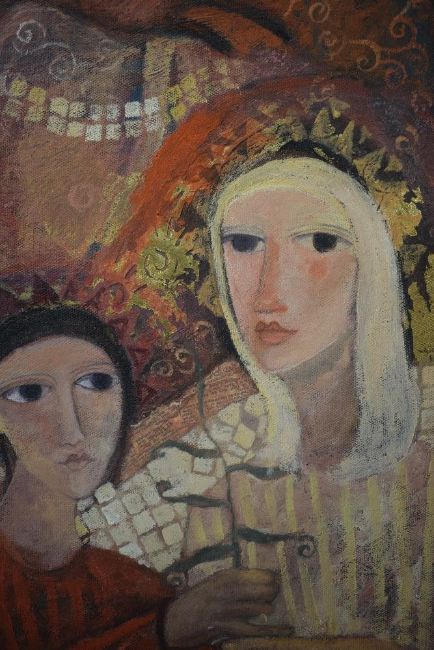 Sharon Winter (Contemporary) Oil on board 'Pilgrim', depicting a mother and child holding a plant with golden embellishment, signed lower right, attribution and title verso, within moulded frame, 29cm x 45cm & 42cm x 58cm overall. Sold alongside a print by the same artist of a woman holding a bowl of apples, signed in pencil to card mount, within flat wooden frame, under glass 12cm x 16.5cm & 30cm x 34cm overall.