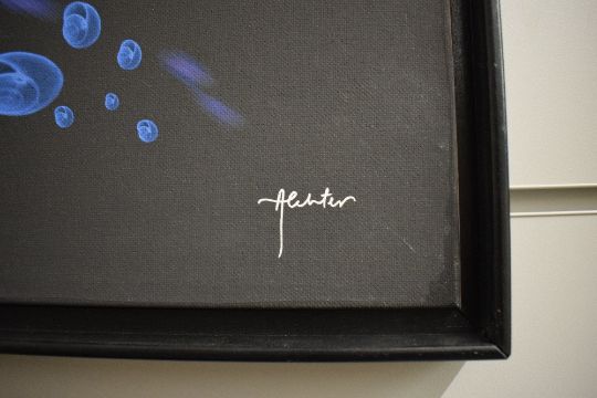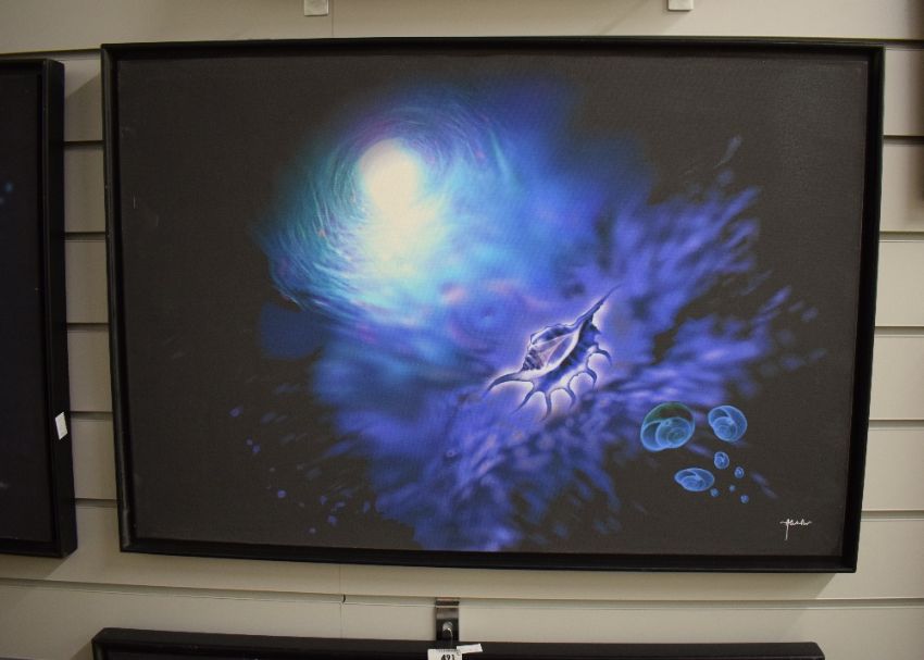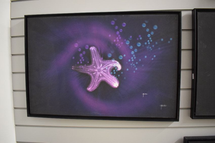 After Akhter (Contemporary) print on canvas, a vibrant starfish in cool tones, signed to lower right, within black tray frame, 76cm x 50cm & 79cm x 54cm overall. Sold alongside two more prints by the same artist following the same theme and framing.